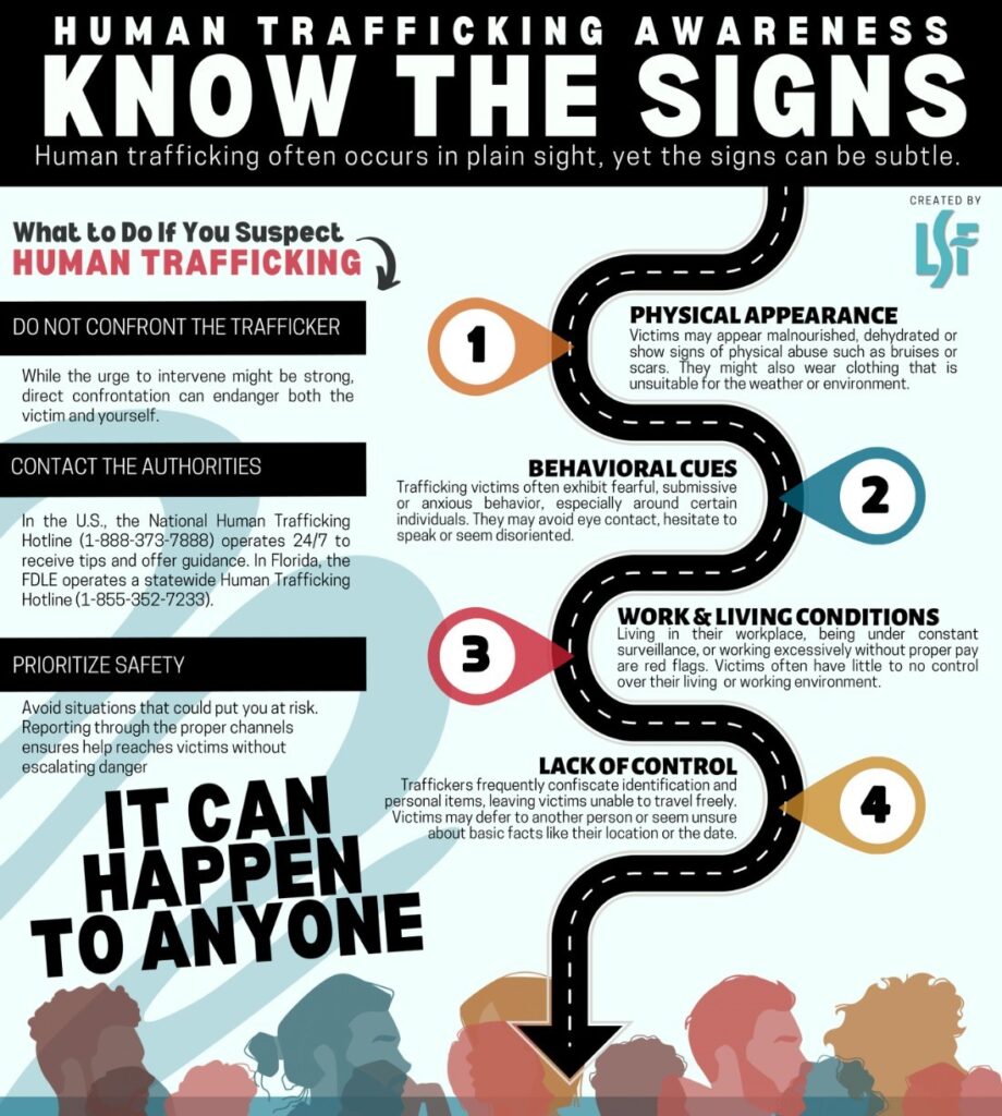 Everyone can play a role in prevention by staying informed and aware of their surroundings. Trust your instincts if a situation feels unsafe or unusual, and do not attempt to intervene directly if it could put you or others at risk. If you suspect trafficking, report it to local law enforcement or contact the National Human Trafficking Hotline at 1-888-373-7888 or text 233733. Tips can be submitted anonymously, and trained advocates can guide next steps. Sharing accurate information and resources within your community also helps raise awareness.
